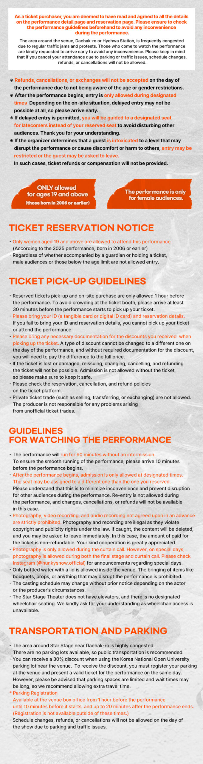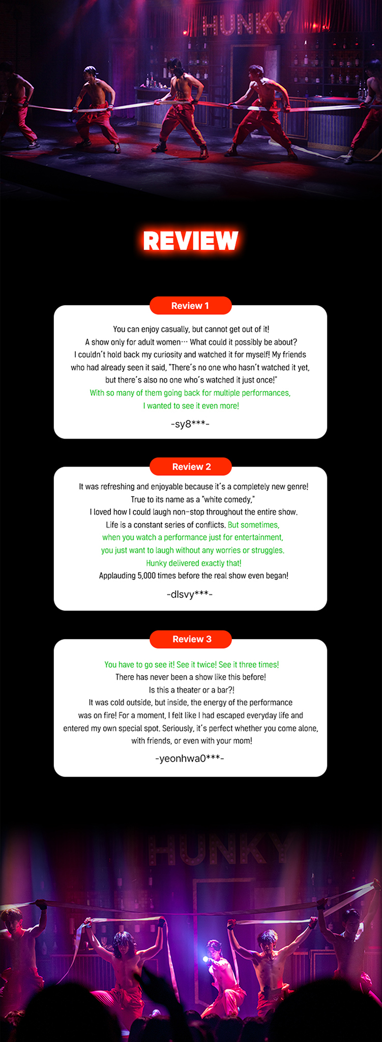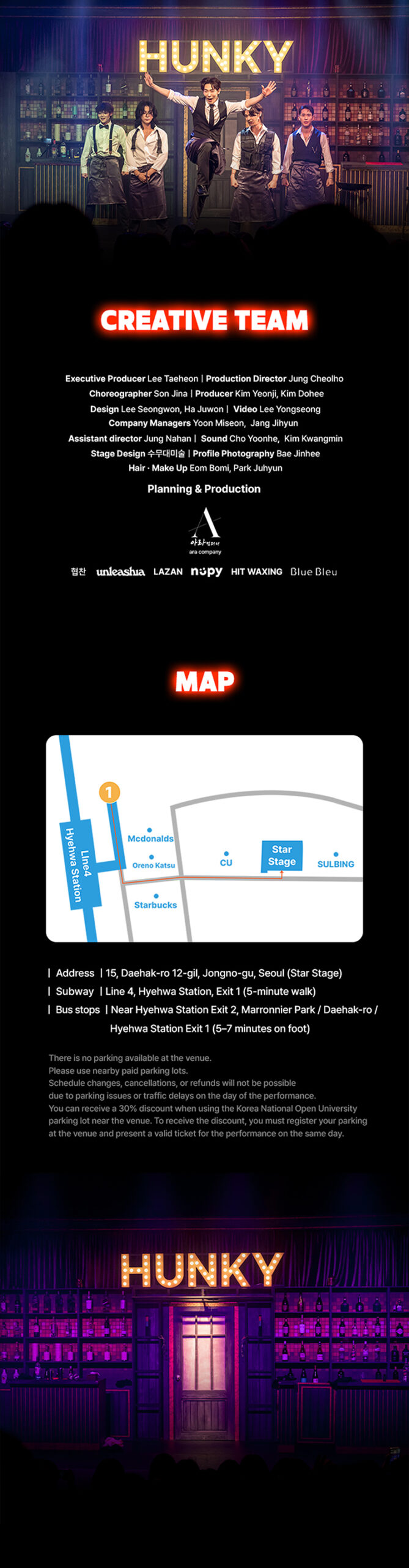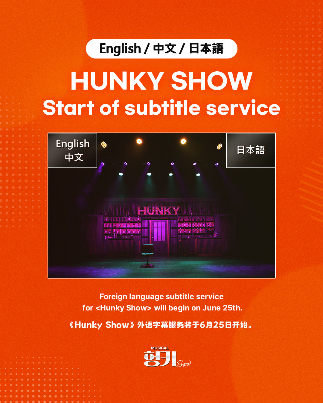 Foreign language subtitles are now available for <Hunky Show>. English subtitles will appear on the left-side monitor, so please keep this in mind when attending the show.