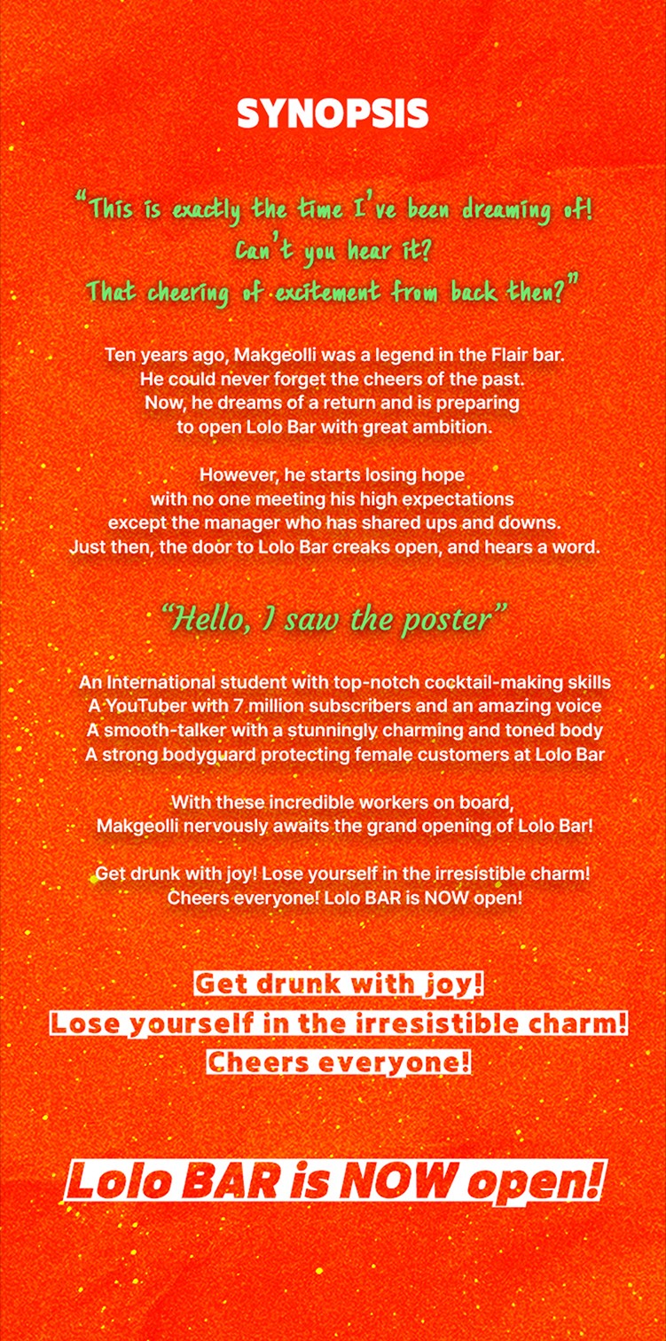 Makgeolli, once a legendary bartender at Paly Bar, longs for the thrill of the stage. With his loyal manager, he opens the LOLO BAR, hoping to recreate the magic. Just when hope fades, extraordinary newcomers walk through the door: