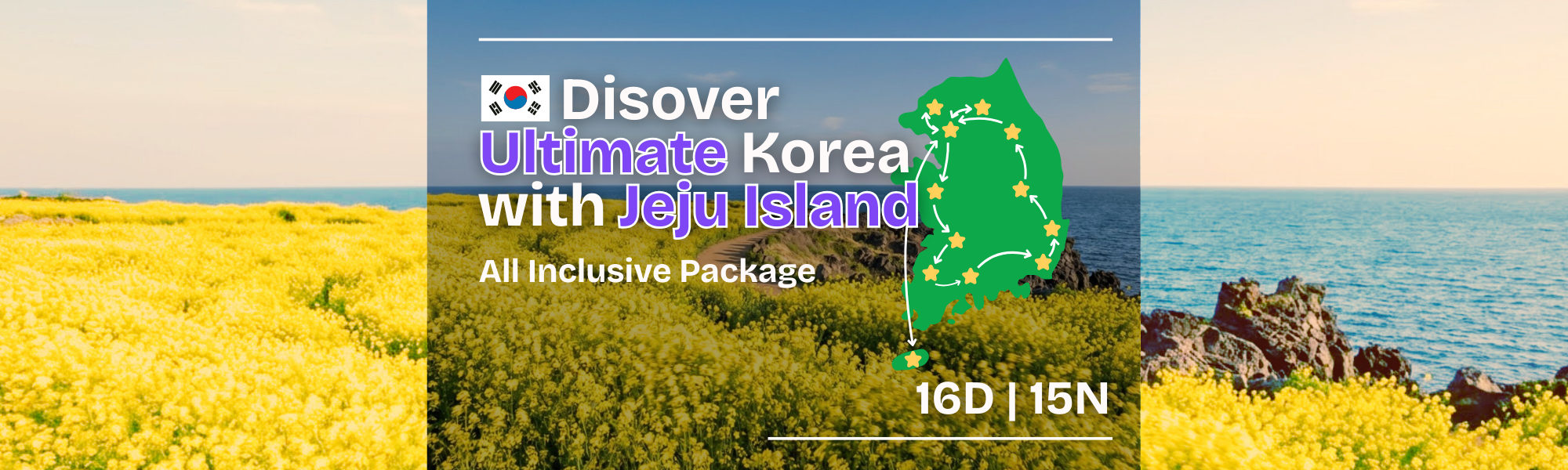 This 15-night, 16-day all-inclusive package covers major cultural cities, scenic coastal regions, and the volcanic landscapes of Jeju Island. It includes 4-5 star accommodations, domestic round-trip flights to Jeju, and comprehensive city tours of Seoul, Busan, Gyeongju, and the DMZ.