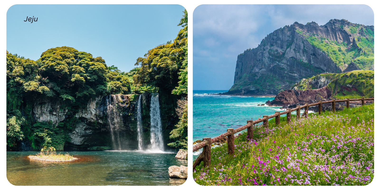 Explore unique volcanic landscapes including majestic waterfalls and the Seongsan Ilchulbong sunrise peak. Other highlights include the Jusangjeolli Cliff rock formations and the O’sulloc Tea Museum.